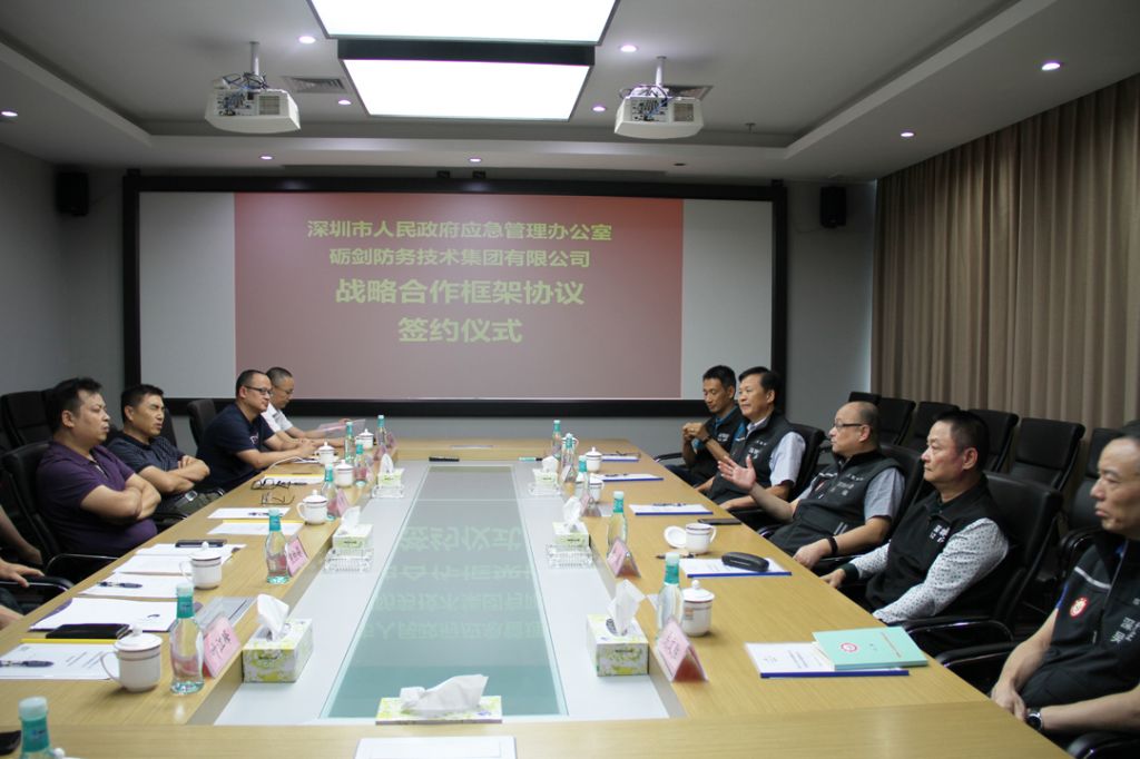 7月19日下午,深圳市应急管理办公室(以下简称:深圳市应急办)和砺剑防务技术集团(以下简称:砺剑集团)签署战略合作协议,并举行了联合创新基地揭牌仪式。深圳市应急办主任杨峰、深圳市应急办副主任杨威、深圳市应急办副巡视员王振部、深圳市应急办人防处副处长吴文胜、深圳市民防指挥保障中心副主任陈平,砺剑集团董事长刘键、砺剑集团副总裁幸智敏等领导嘉宾,共同见证签约和揭牌仪式。